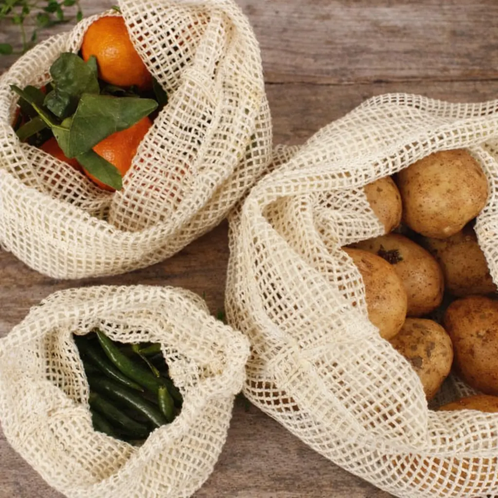 A reusable set of organic cotton muslin mesh bags designed for everyday storage and shopping. Lightweight yet durable, these bags are ideal for fruits, vegetables, dry goods and pantry organisation, helping reduce the need for single-use plastic bags.